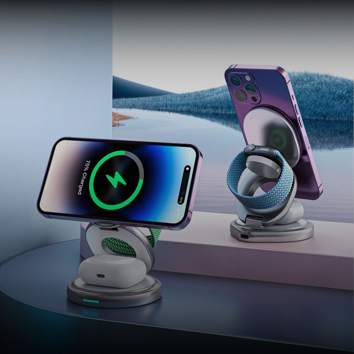 Experience the freedom of a charging solution that adapts to you. Our innovative charging station is built for those who don’t stand still, offering fast, efficient power to your iPhone, Apple Watch, and AirPods. Whether you’re juggling tasks in the office, enjoying downtime at a cafe, or simply relaxing at home, stay effortlessly connected and charged. Life is unpredictable; your power source shouldn't be.