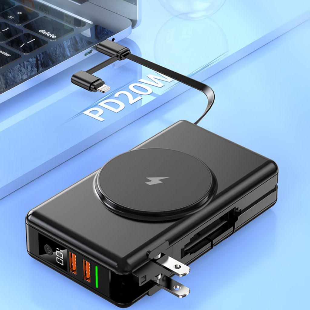 The Universal Power Bank is versatile and can charge almost any mobile device that has a USB-C or lightning charging port, as well as any device that supports Qi wireless charging. Moreover, the Universal Power Bank comes with built-in lightning and USB-C cables, eliminating the need for additional charging cables.